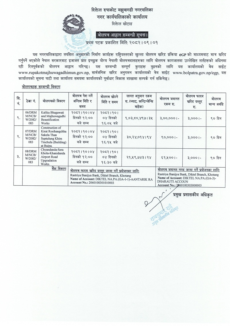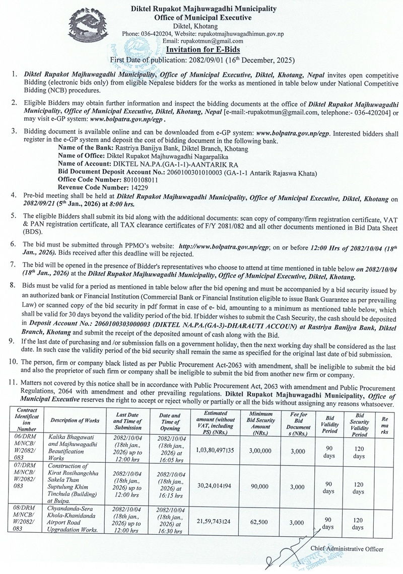 बोलपत्र आह्वान सम्बन्धी सूचना- कालिका भगवती तथा मझुवागढी सौन्दर्यकरण योजना, किरात रोसिहङ्छा साकेला थान सुप्तुलुङ खिम तिनचुला (भवन) निर्माण योजना, च्यानडांडा-सेरा खोला-खानीडांडा एयरपोर्ट सडक स्तरोन्नती योजना।(प्रकाशित मितिः२०८२।०९।०१)