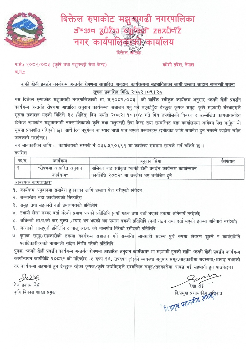 कफी खेती प्रवर्द्धन कार्यक्रम अन्तर्गत रोपणमा आधारित अनुदान कार्यक्रममा सहभागिताका लागी प्रस्ताव आह्वान सम्बन्धी सूचना। (प्रकाशित मितिः २०८२।०९।२८)