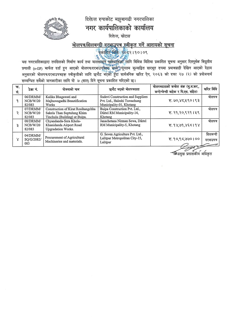 बोलपत्र/सिलबन्दी दरभाउपत्र स्वीकृत गर्ने आशयको सूचना । (प्रकाशित मितिः २०८२।१०।०९)