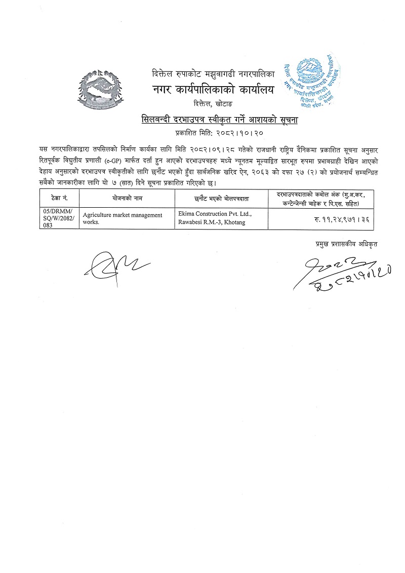 सिलबन्दी दरभाउपत्र स्वीकृत गर्ने आशयको सूचना । (प्रकाशित मितिः २०८२।१०।२०)