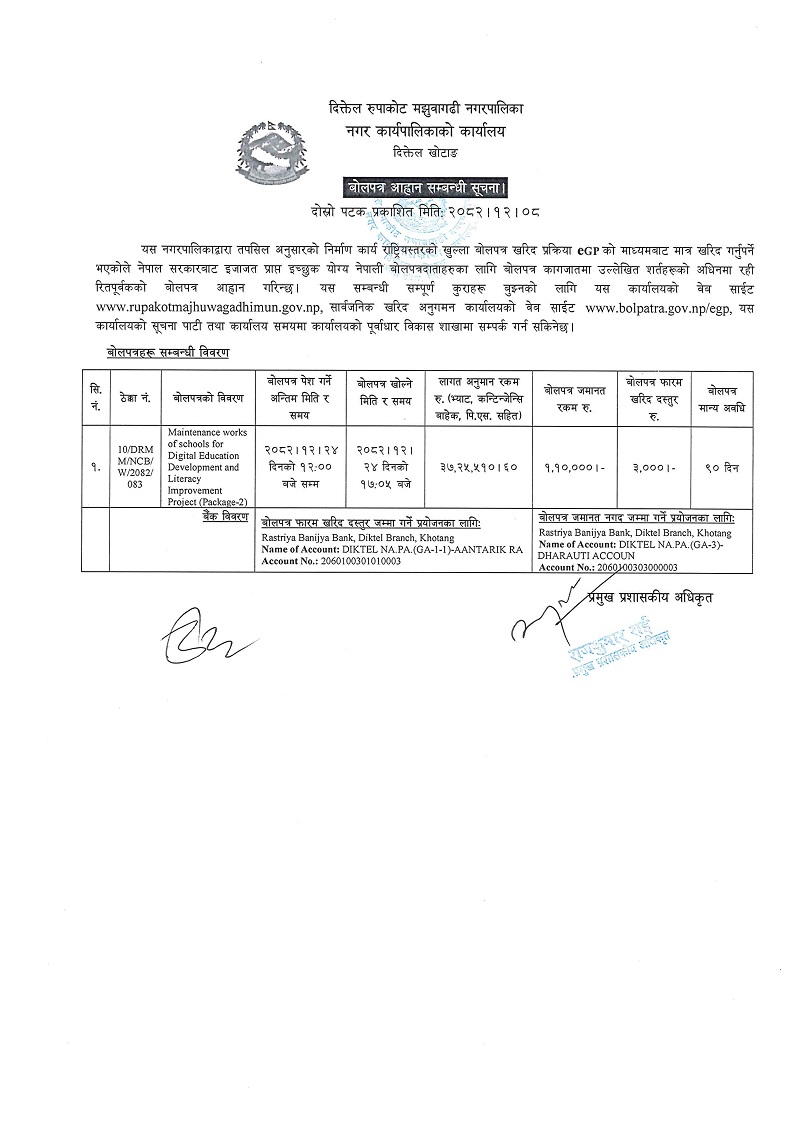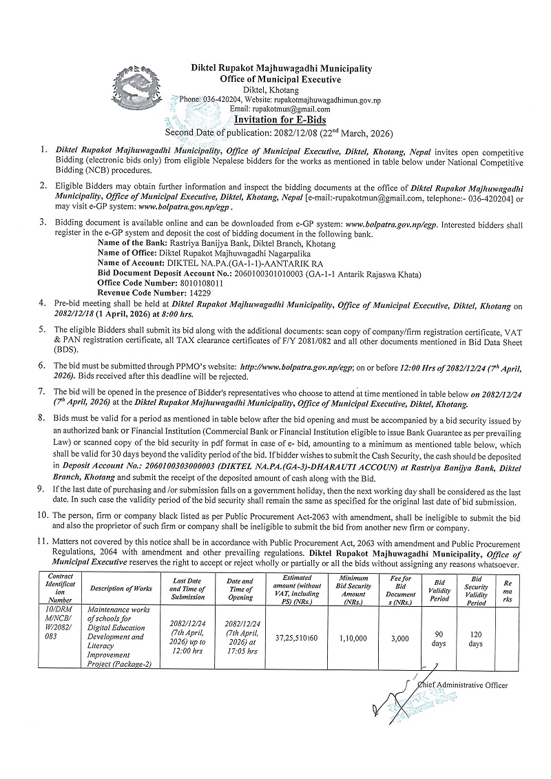 बोलपत्र आह्वान सम्बन्धी सूचना। (प्रथम पटक प्रकाशित मितिः २०८२।१२।१५ गते)