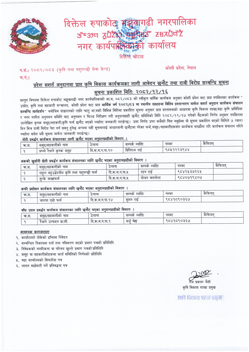 प्रदेश सशर्त अनुदानमा प्राप्त कृषि विकास कार्यक्रमका लागी आवेदन छनौट तथा दावी विरोध सम्बन्धि सूचना । (सूचना प्रकाशित मितिः २०८२/१२/१६ गते)