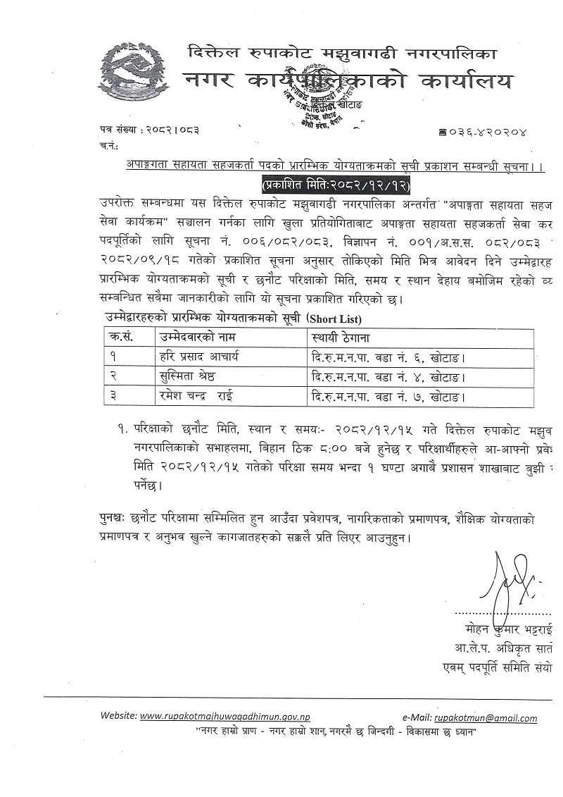 » अपाङ्गगता सहायता सहजकर्ता पदको प्रारम्भिक योग्यताक्रमको सूची प्रकाशन सम्बन्धी सूचना । (प्रकाशित मितिः २०८२/१२/१२)