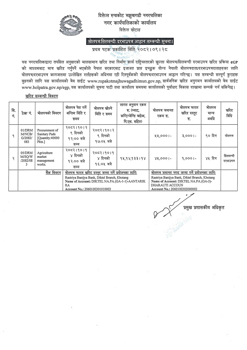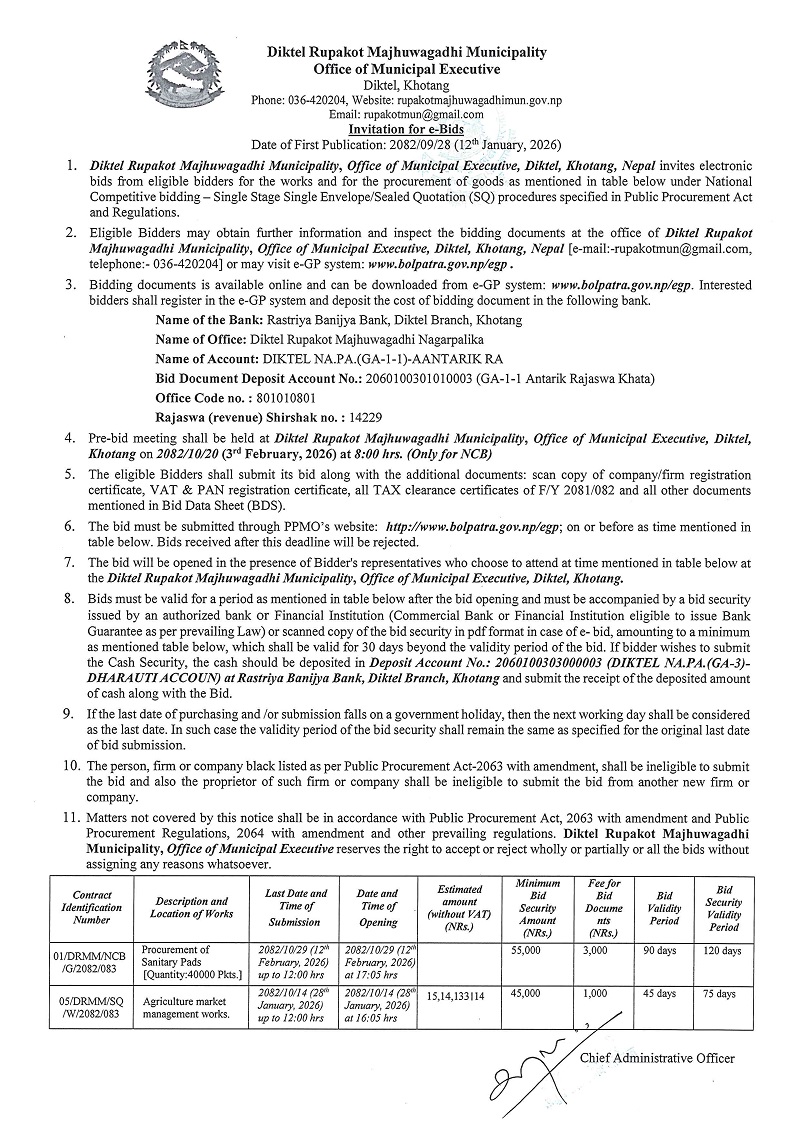 बोलपत्र आह्वान सम्बन्धी सूचना। (प्रथम पटक प्रकाशित मितिः २०८२।१२।१५ गते)