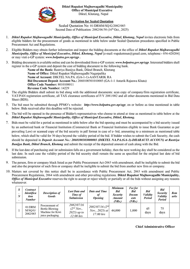 बोलपत्र आह्वान सम्बन्धी सूचना- कालिका भगवती तथा मझुवागढी सौन्दर्यकरण योजना, किरात रोसिहङ्छा साकेला थान सुप्तुलुङ खिम तिनचुला (भवन) निर्माण योजना, च्यानडांडा-सेरा खोला-खानीडांडा एयरपोर्ट सडक स्तरोन्नती योजना।(प्रकाशित मितिः२०८२।०९।०१)