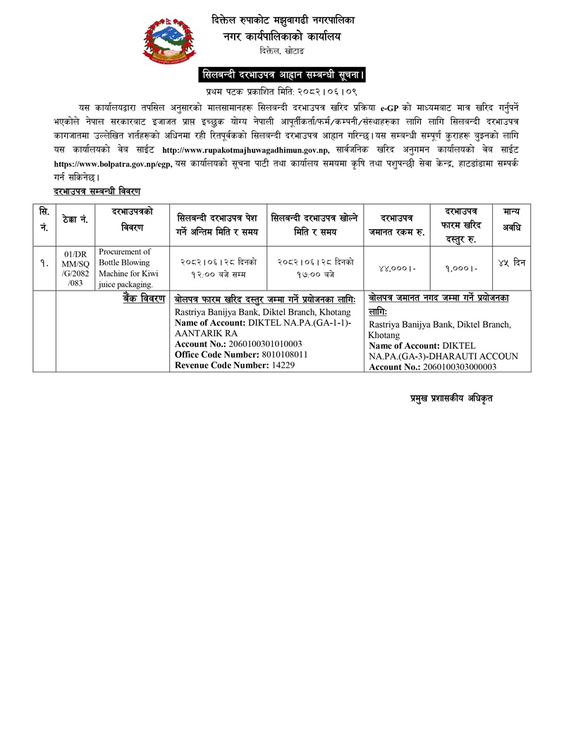 सिलबन्दी दरभाउपत्र आह्वान सम्बन्धी सूचना- किवी जुस प्याकेजिङको लागि बोतल ब्लोइङ मेसिन खरिद। (प्रथम पटक प्रकाशित मिति: २०८२।०६।०९)