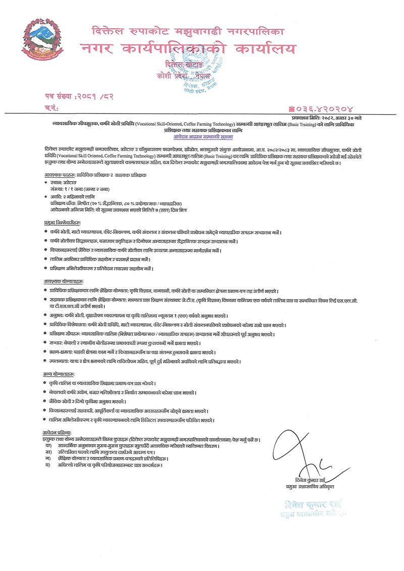 व्यवसायिक सीपमूलक, कफी खेती प्रविधि (Vocational Skill-Oriented, Coffee Farming Technology) सम्बन्धी आधारभूत तालिम (Basic Training) को लागि प्राविधिक प्रशिक्षक तथा सहायक प्रशिक्षकका लागि आवेदन आह्वान सम्बन्धी सूचना