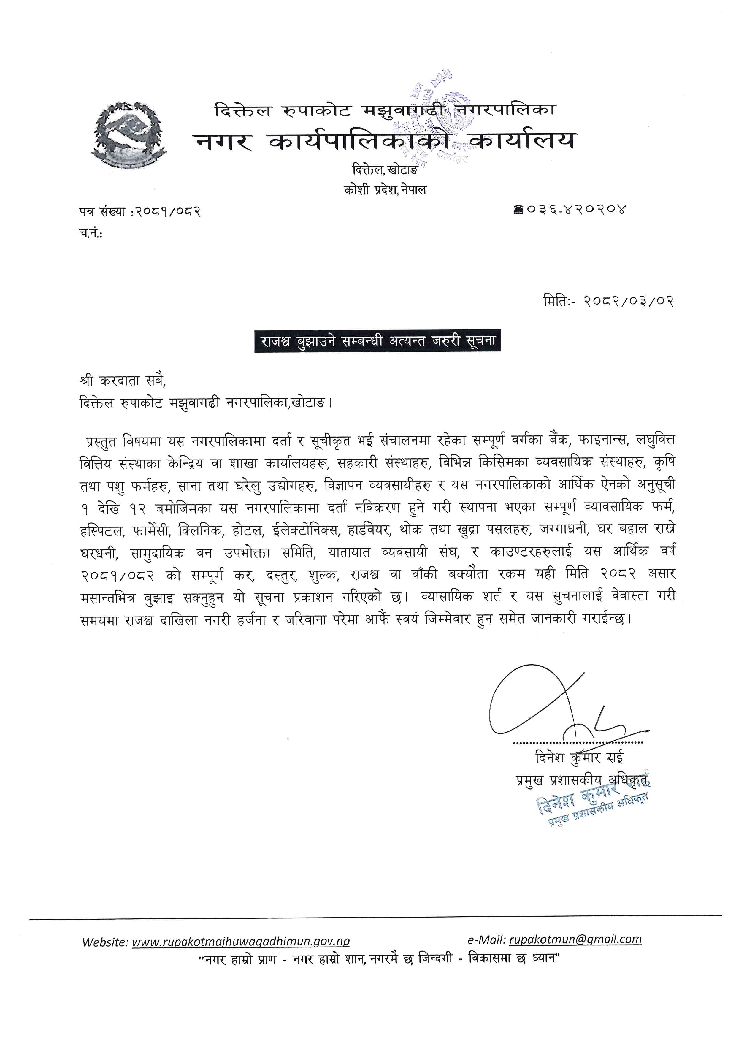 राजश्व बुझाउने सम्बन्धी अत्यन्त जरुरी सूचना (प्रकाशित मिति २०८२।०३।०२ गते)