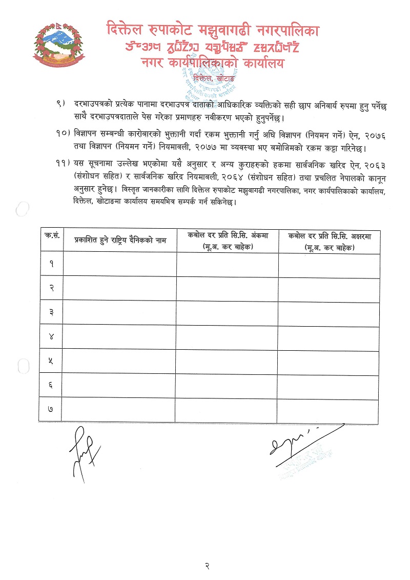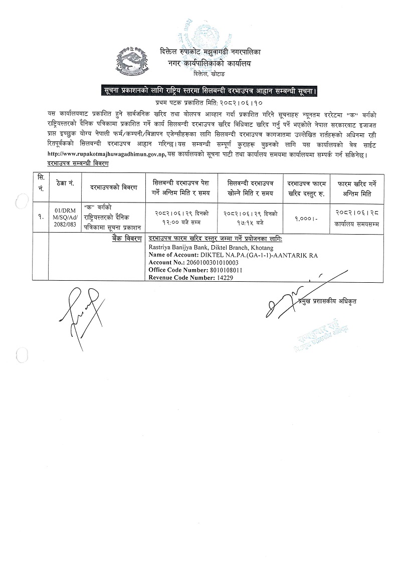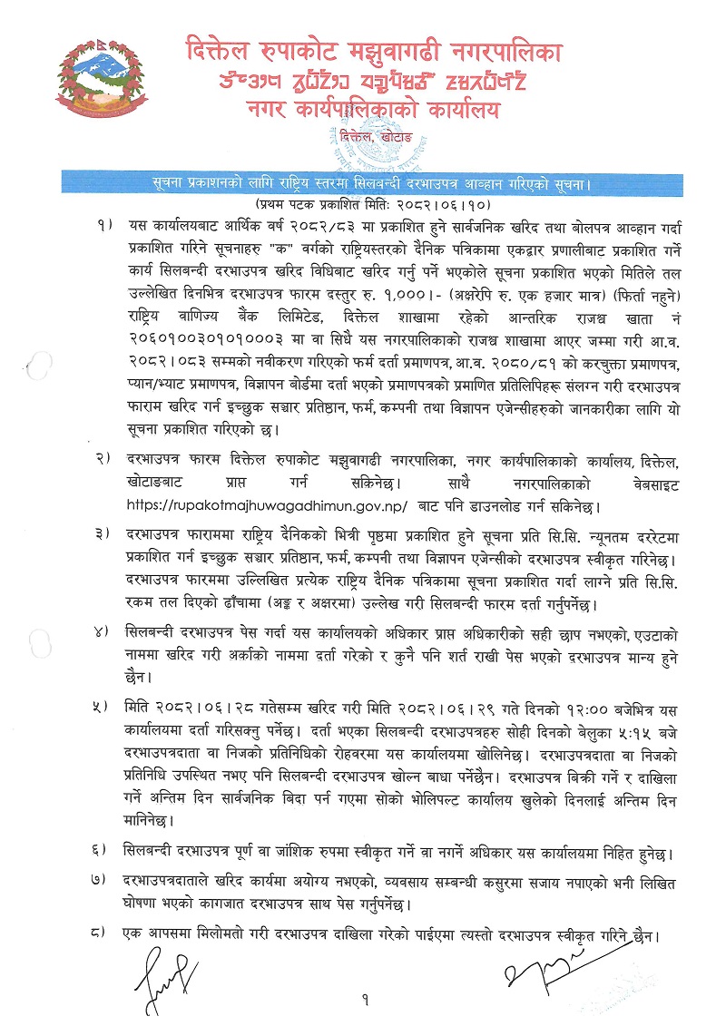 सूचना प्रकाशनको लागि राष्ट्रिय स्तरमा सिलबन्दी दरभाउपत्र आह्वान सम्बन्धी सूचना। (प्रकाशित मिति २०८२।०६।१० गते)