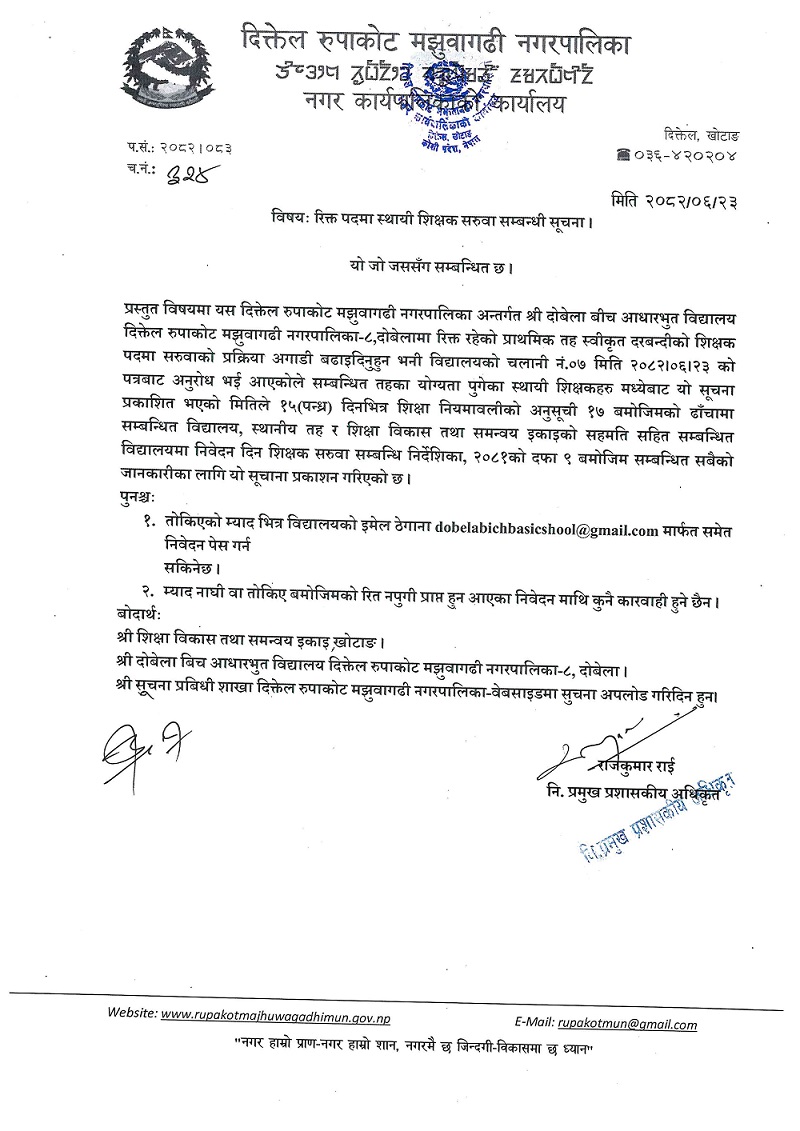 रिक्त पदमा स्थायी शिक्षक सरुवा सम्बन्धी सूचना । (सूचना प्रकाशित मिति २०८२।०६।२३)