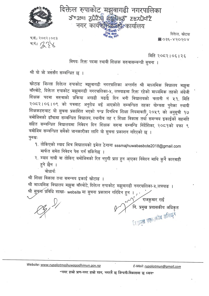 » रिक्त पदमा स्थायी शिक्षक सरुवा सम्बन्धी सूचना । (प्रकाशित मिति :२०८२।०६।२६ गते)