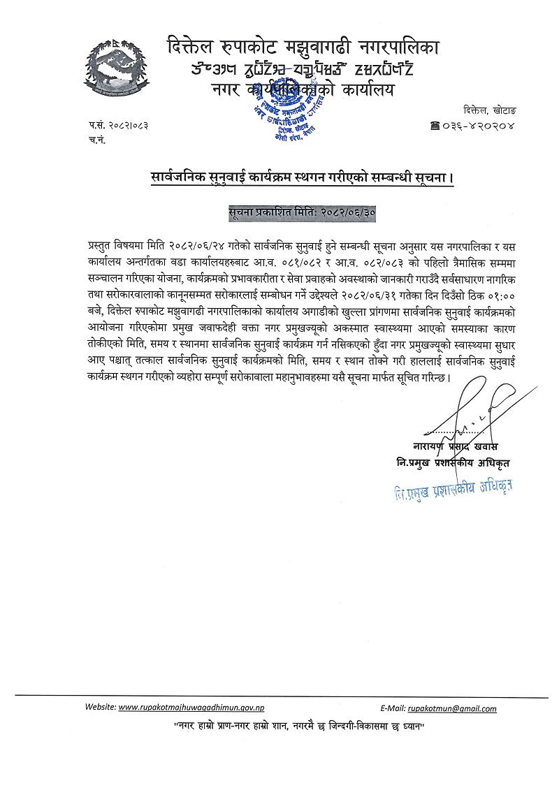 सार्वजनिक सुनुवाई कार्यक्रम स्थगन गरीएको सम्बन्धी सूचना । (सूचना प्रकाशित मितिः २०८२/०६/३०)