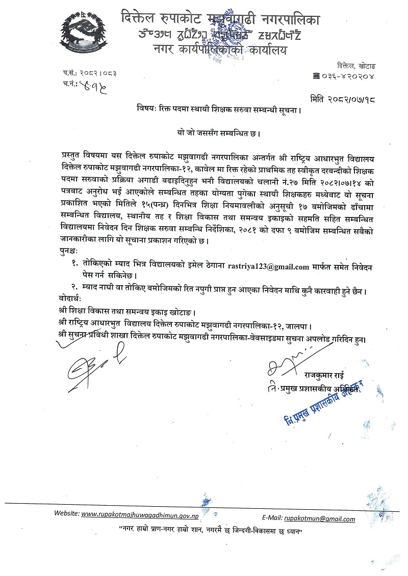 रिक्त पदमा स्थायी शिक्षक सरुवा सम्बन्धी सूचना । (सूचना प्रकाशित मिति २०८२।०७।१८ गते)