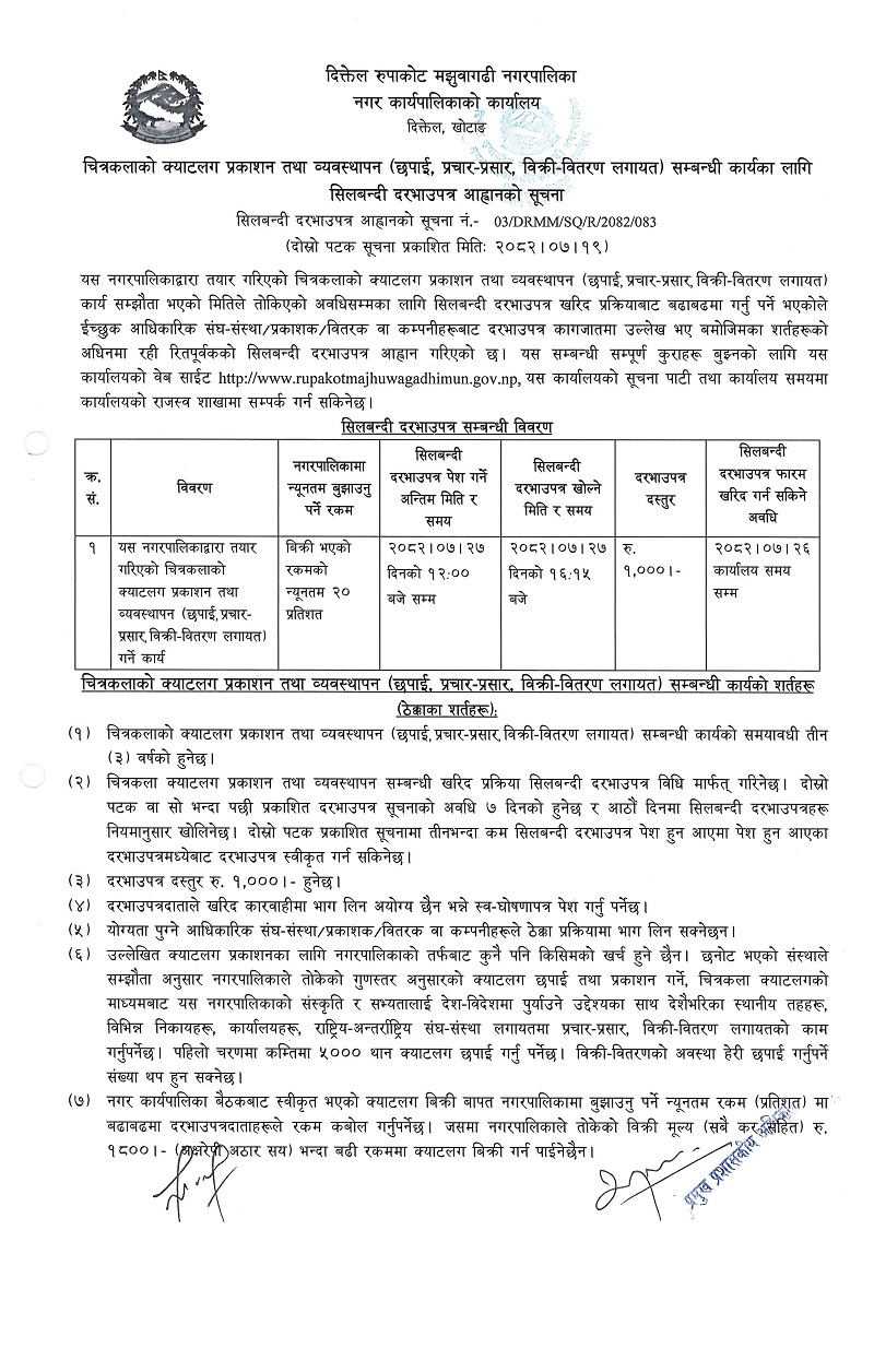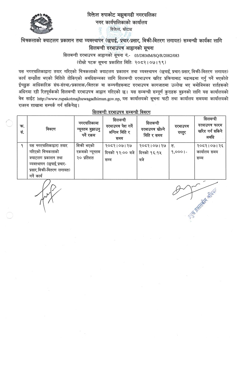 चित्रकलाको क्याटलग प्रकाशन तथा व्यवस्थापन (छपाई,प्रचार-प्रसार, विक्री वितरण लगायत)(सूचना प्रकाशित मिति २०८२।०७।१९ गते)