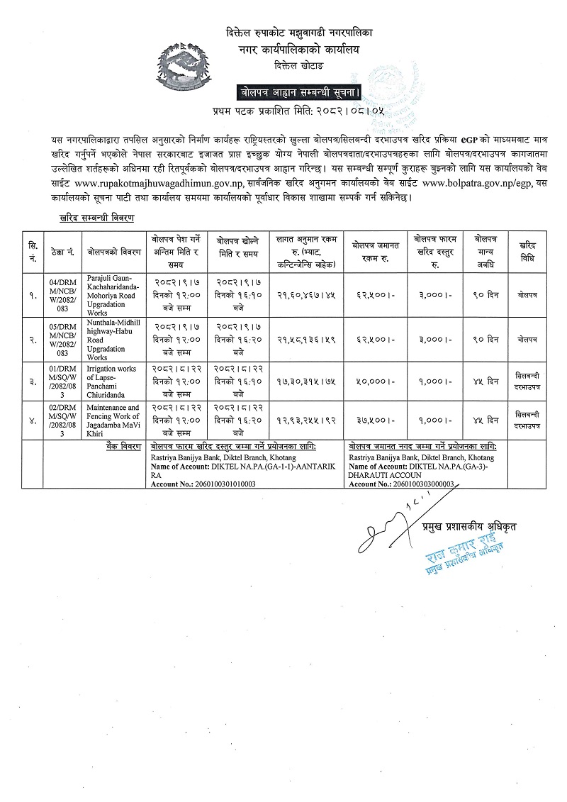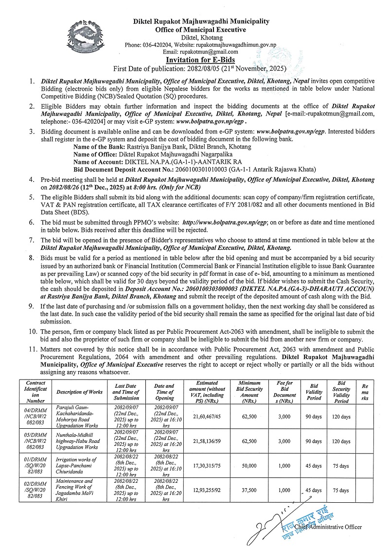 बोलपत्र/सिलबन्दी दरभाउपत्र आह्वान सम्बन्धी सूचना । (सूचना प्रकाशित मिति २०८२।०८।०५ गते)