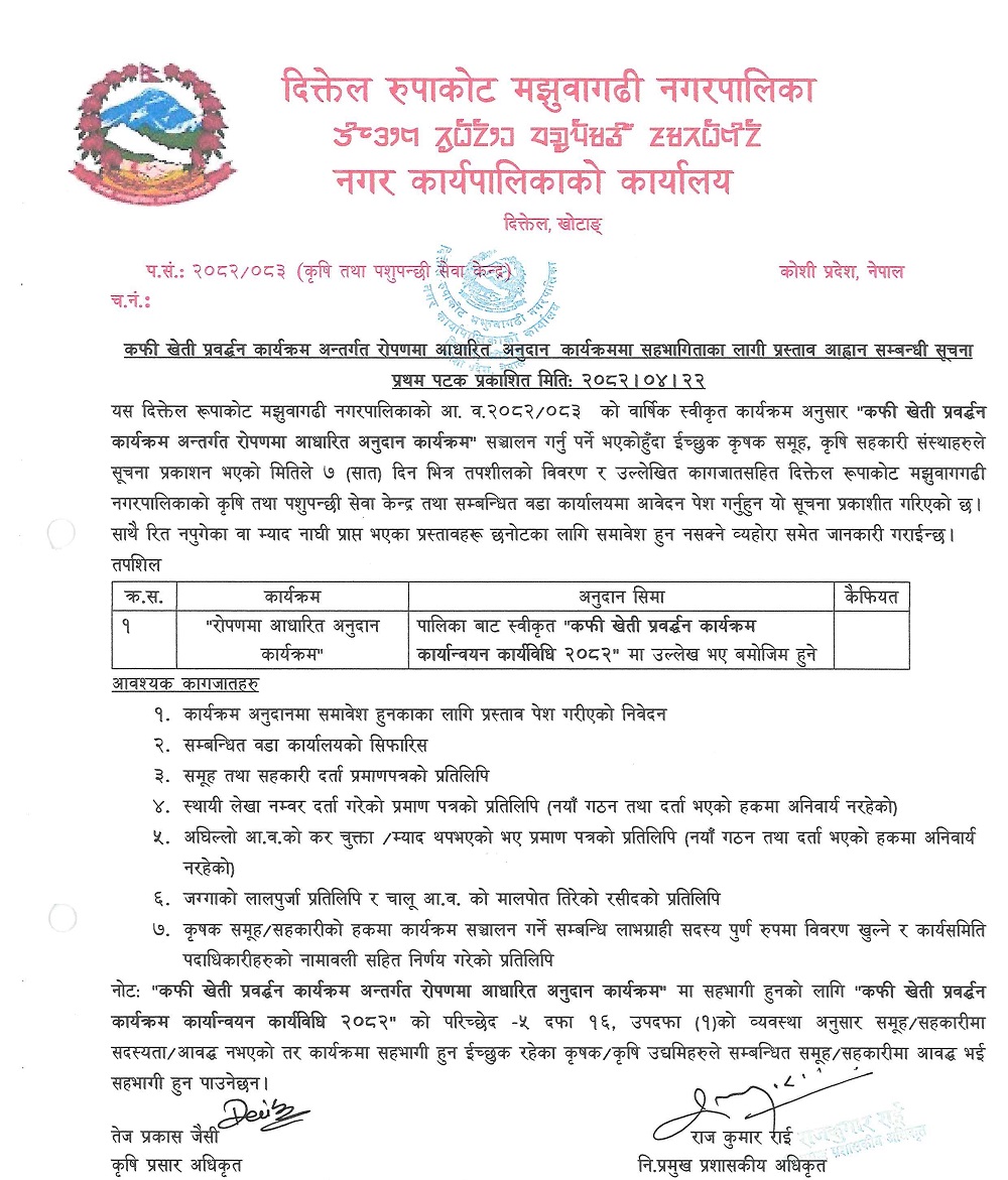 कफी खेती प्रवर्दन कार्यक्रम अन्तर्गत रोपनमा आधारित अनुदान कार्यक्रममा सहभागिताका लागि प्रस्ताव आव्हान सम्बन्धि सूचना । (प्रकाशित मिति २०८२।०४।२२ गते)