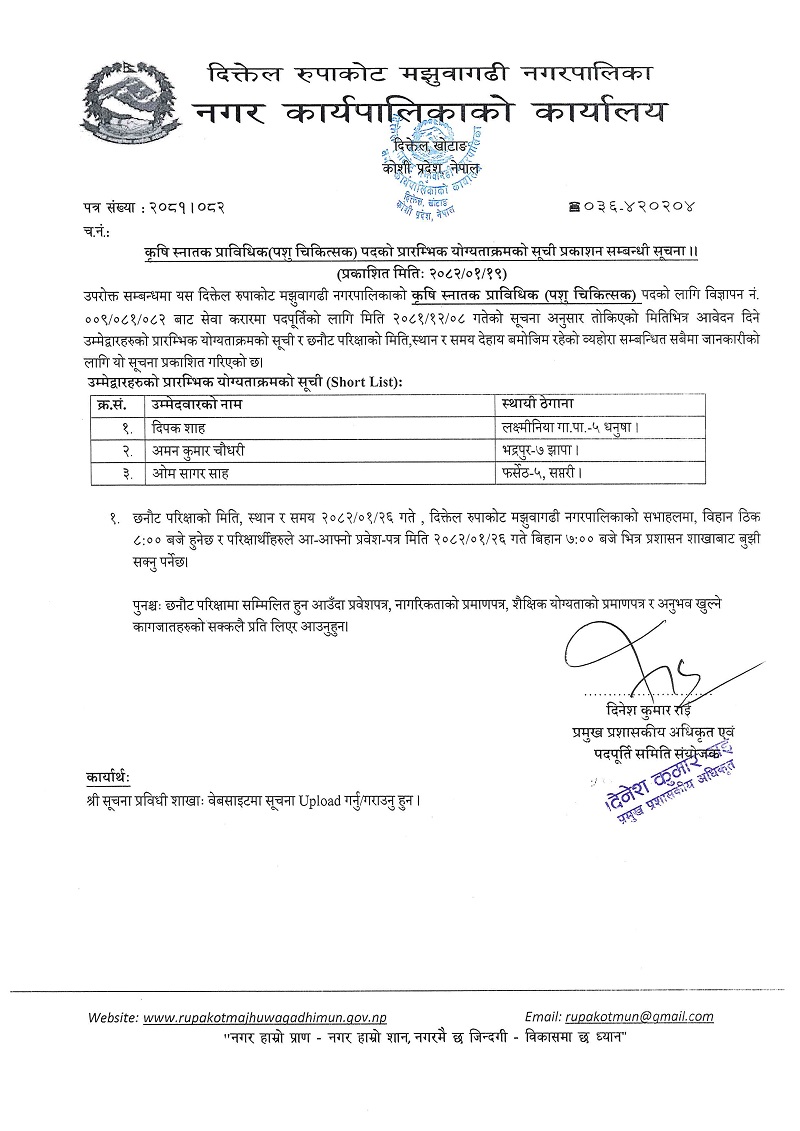 कृषि स्नातक प्राविधिक (पशु चिकित्सक) पदको प्रारम्भिक योग्यताक्रमको सूची प्रकाशन सम्बन्धी सूचना । (प्रकाशित मिति २०८२।०१।१९)