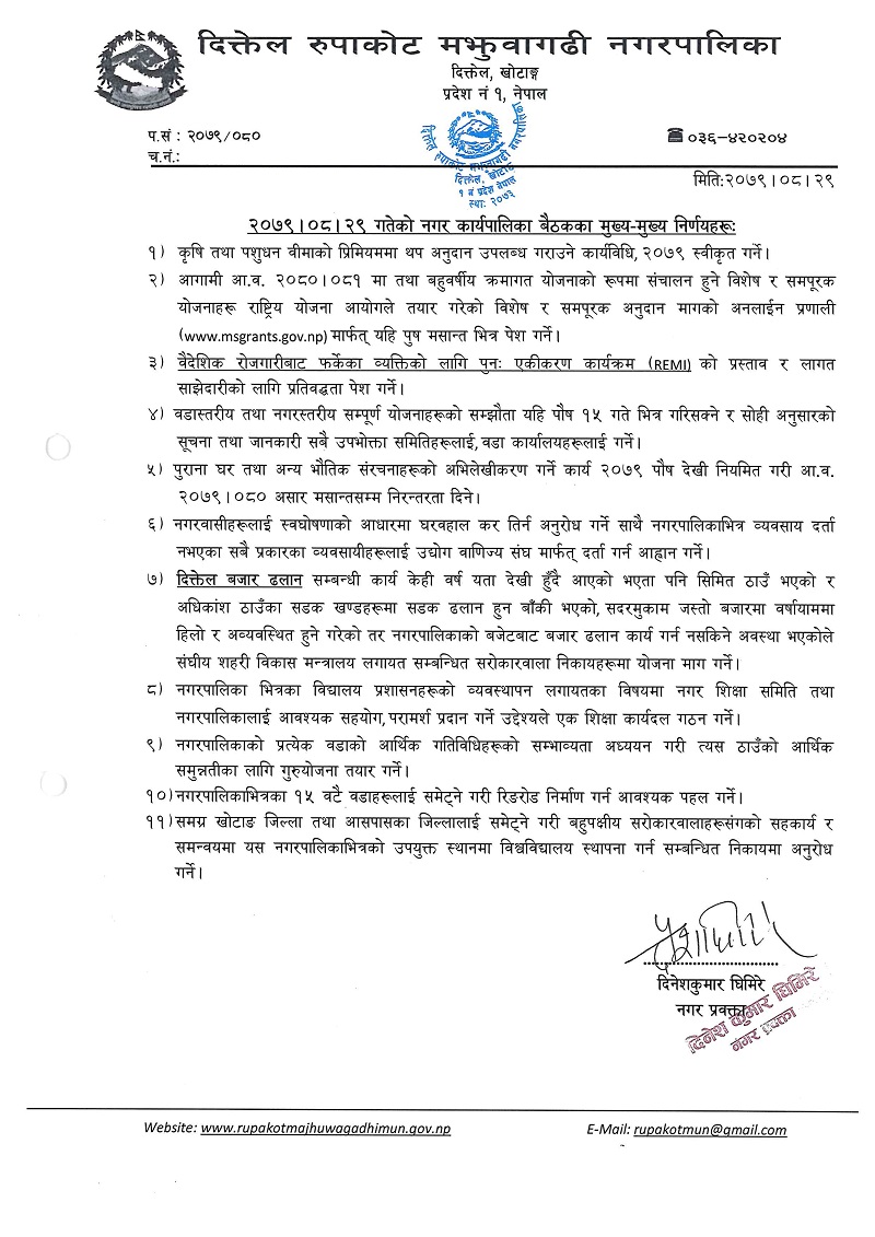 मिति २०७९।८।२९ गते बसेको नगर कार्यपालिका बैठकका निर्णयहरू